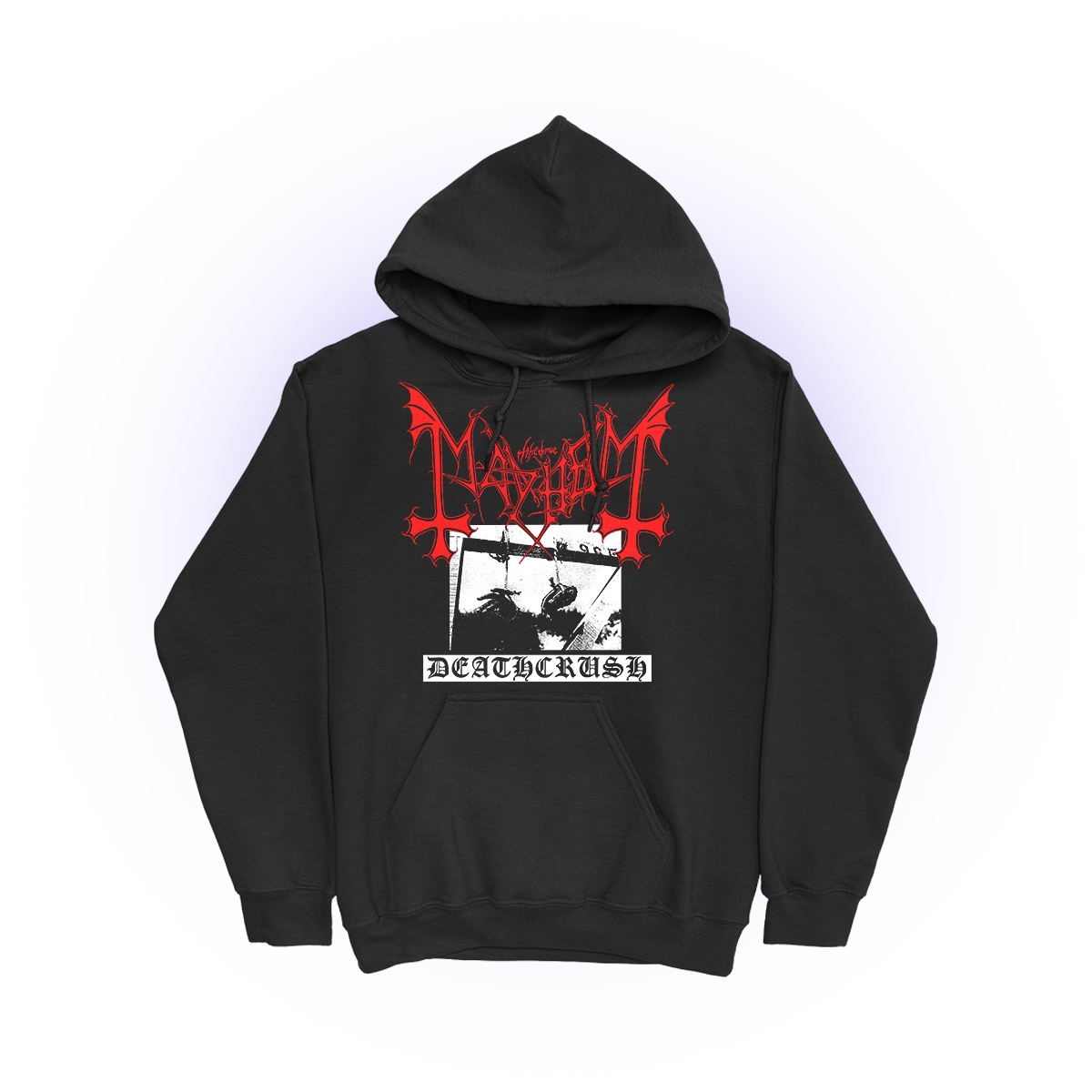 The Mayhem Deathcrush design, printed on a comfortable, standard-fitting black pullover hoodie.
